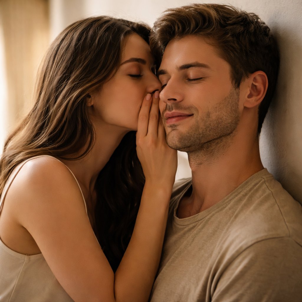 A girl whispering in a man’s ear against the wall