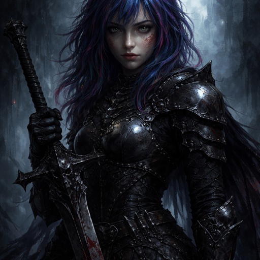 A 17 year old girl who has blue hair with pink and purple stripes and has hazel eyes. She is wearing tight armor and has...