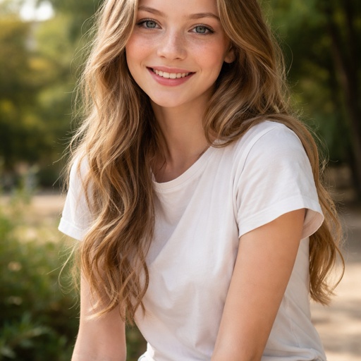 A 17 year old girl who has dirty blonde hair and blue eyes. She is wearing a white shirt and jeans. She has a warm smile...