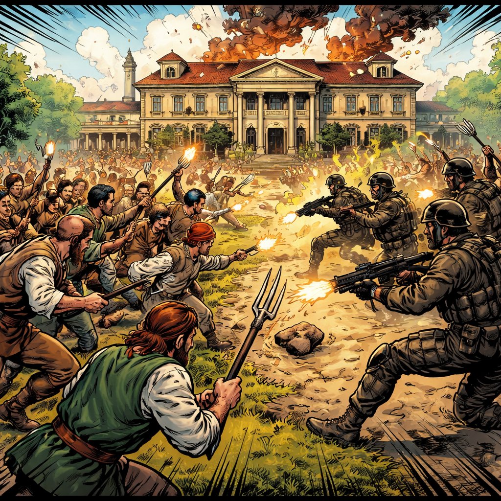 Refined realistic no caricature no speech bubble a large mansion in front of it two groups are fighting. One group is made of peasants and the others is made of modern soldiers with automatic weapons. Longview horizontal orientation.