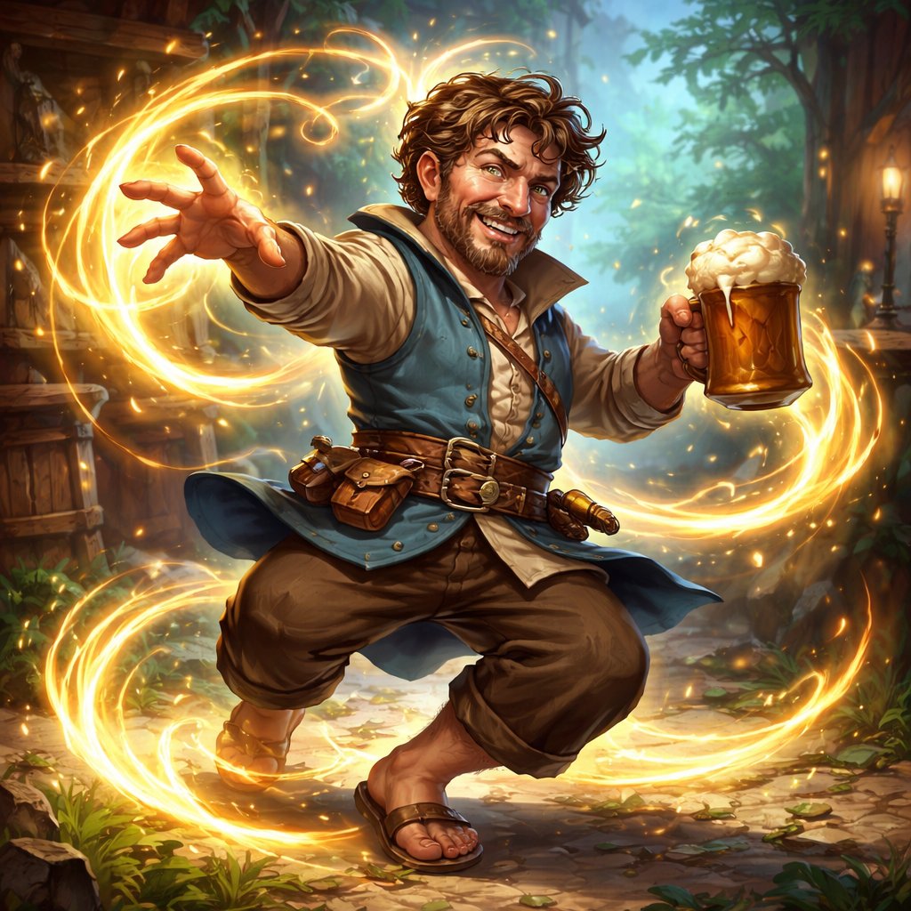 A middle aged male halfling with brown hair and a brown beard. He wears light robes including a blue jerkin and fights a...