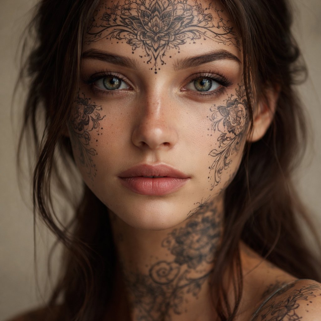 Full picture of a blonde Asian girl with green and red Japanese tattoos all over her face and no piercings