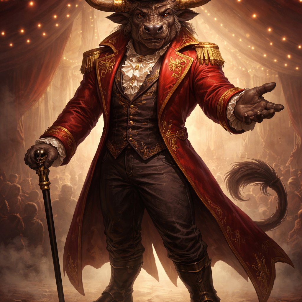 A male Minotaur that’s 6 1/2 feet tall. He has a smooshed human-Cretan bull face with deep set bovine like brown eyes. On his Head were large powerful gleaming curved horns like his fathers. He has a well~proportioned figure/body and a long tail, with his skin/fur a captivating Taupe color. He works at freak show as the ringmaster. His outfit consists of a crimson tailcoat, frilly shirt, stunning blazer, pants and top hat. His abilities are Reality Rejection, Time Manipulation (Chronokineses), Zoolingualism (Language of Cattle only), Human Speech.