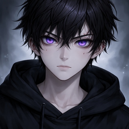 Black hair, purple eyes, pale ghost like grayish skin, 14, male, scar on left brow