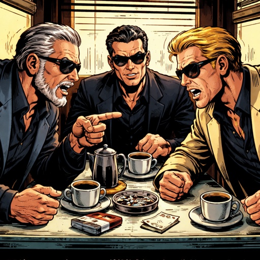 Too well dressed, criminal types, and sunglasses are sitting at a diner table having a discussion. One is older with gra...