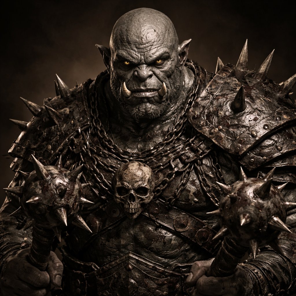 Ogre grey skin bald head spike leather armour holding two maces with spikes