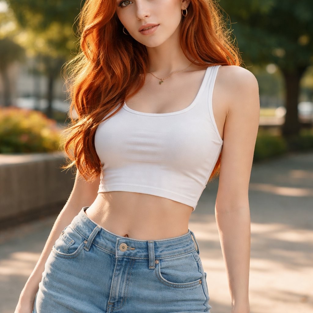 A redhead girl in a crop top and bikini bottom with a navel piercing