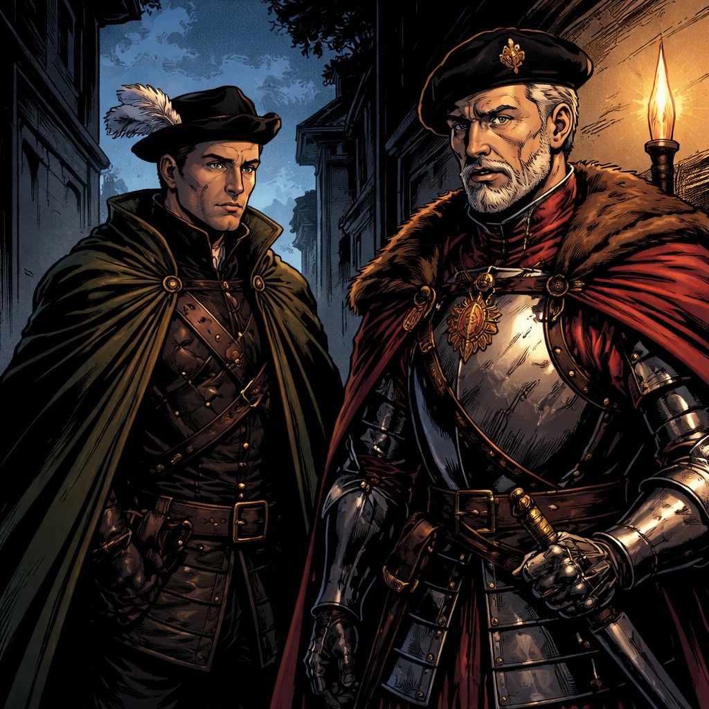 Refined realistic, no caricature in the foreground two military men are speaking. They are addressed in renaissance robes. They occupy the right hand side of the photo One is a general. The other is a secret agent. it is evening, mysterious scene.