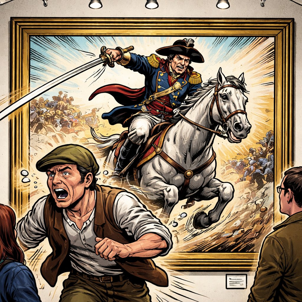 Painting in an art gallery of an old-fashioned general on horseback waving his sword at a peasant who was running away