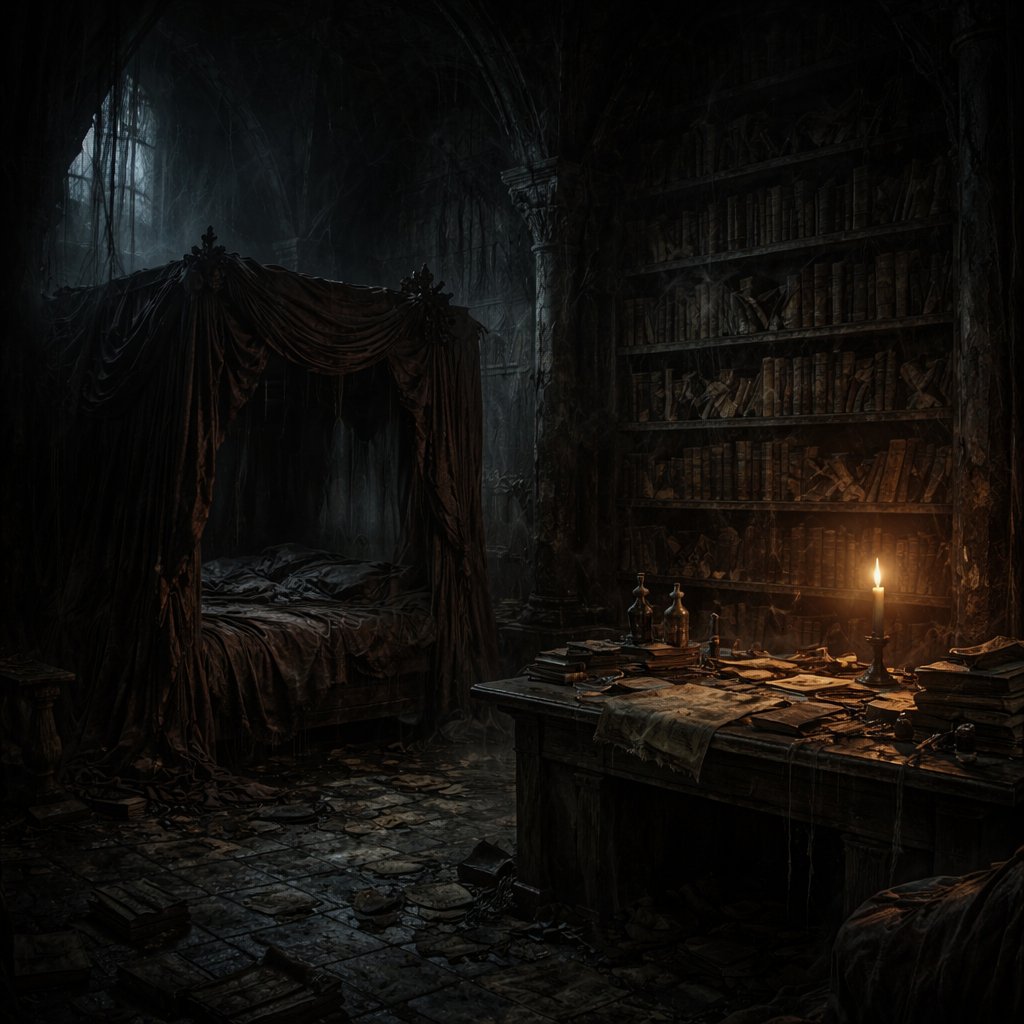 A huge room that in the left corner had a bed with four pillars. To the very right of the room is a long book shelf of books. In front of the book shelf is a wooden desk that has papers on it. There is a single light on the desk and that is the only force of light in the room.