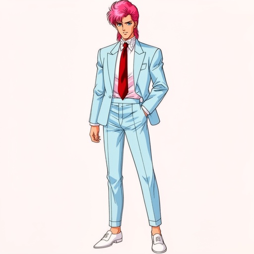 80s New Romantic man in suit with jacket just above the waist the trousers vice the ankle shirt is high collared tie mad...