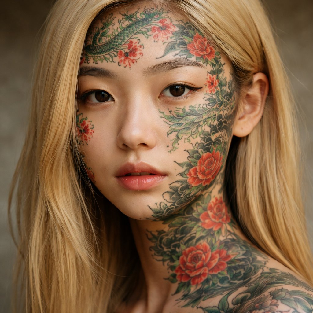 Blonde Asian girl with green and red Japanese tattoos all over her face and no piercings