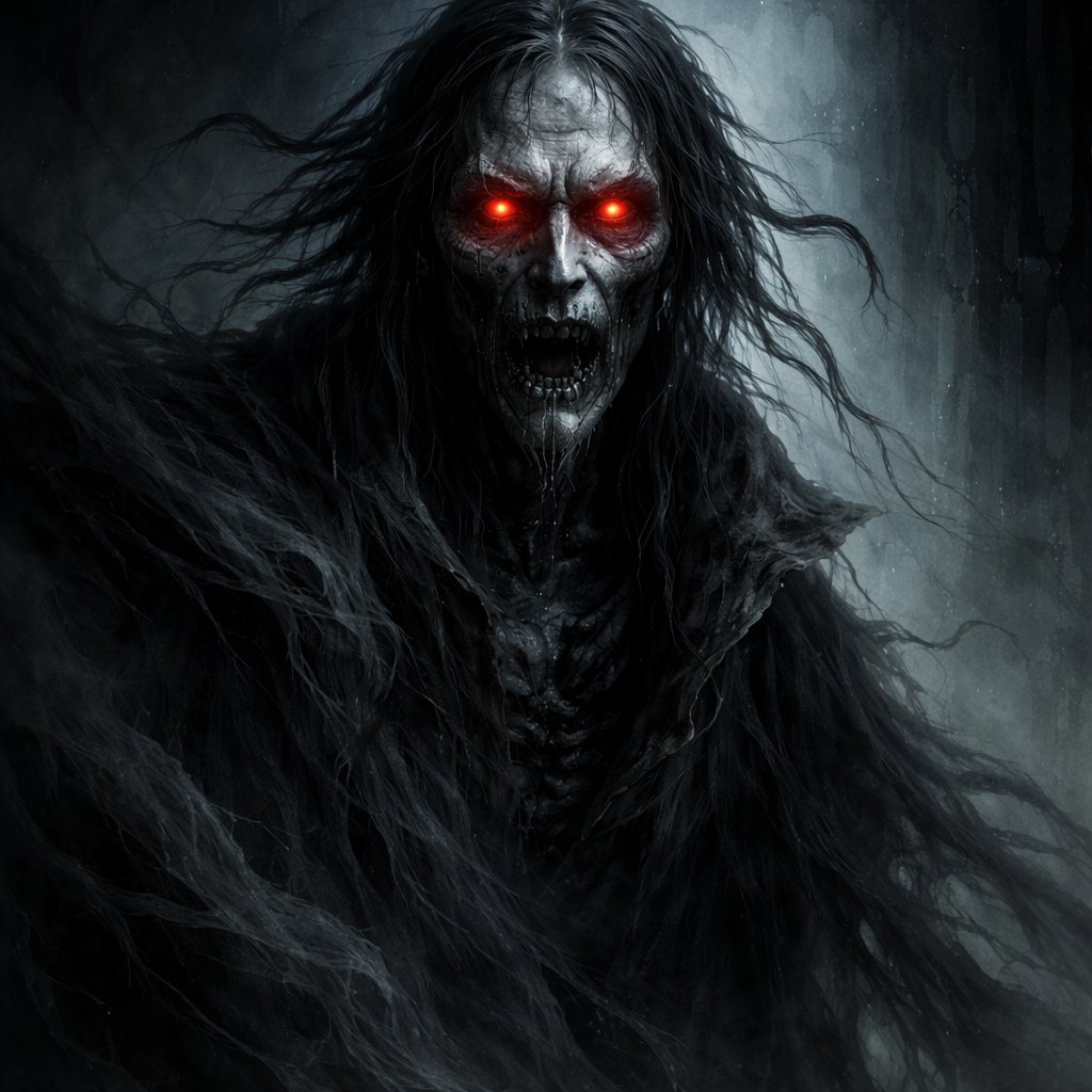 Male ghost , eyes glowing with malice that defined his life , a skull for the head