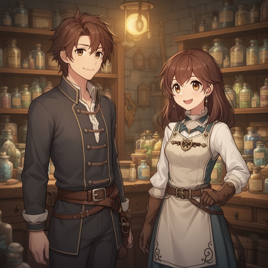 Man and Woman siblings, twins, shop owners, apothecary shop, Brown hair, brown eyes, smiling, D&D, standing apart