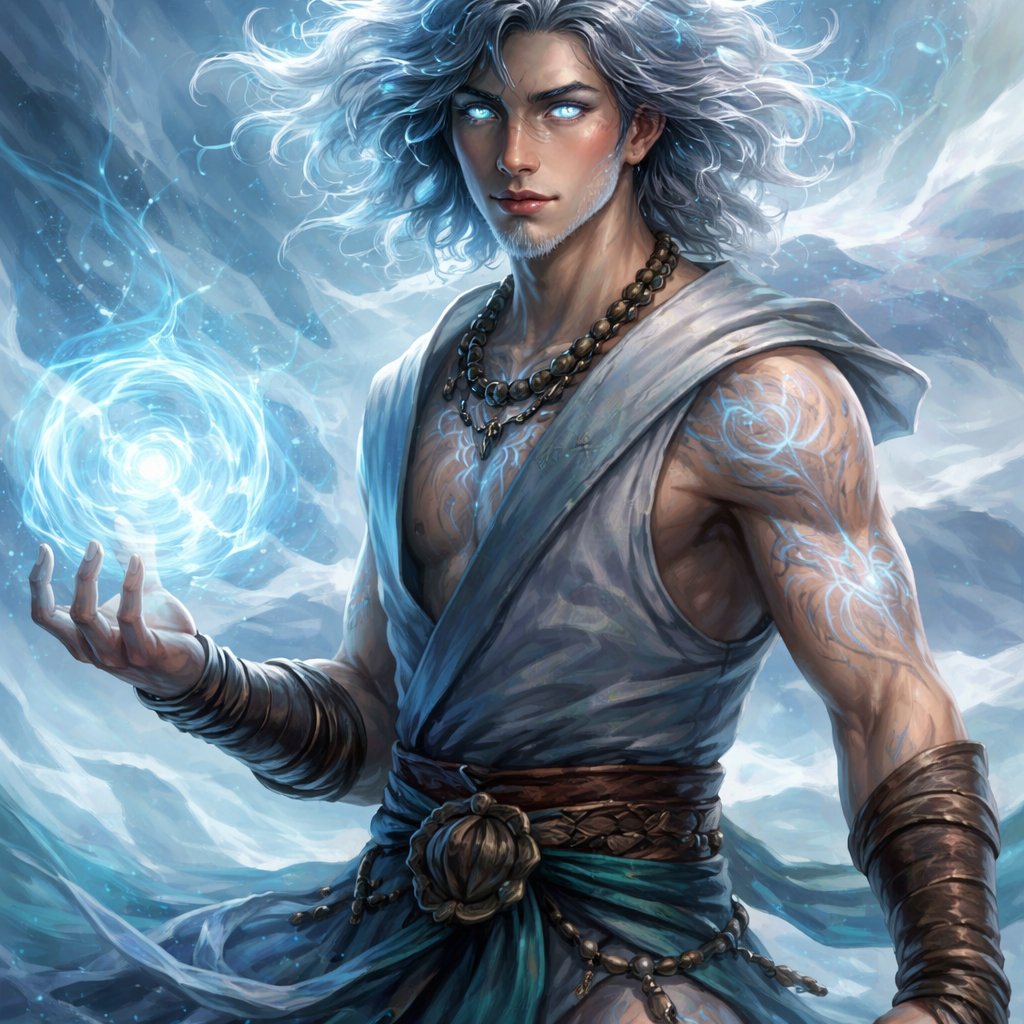 Air Genasi Monk, young man in his late teens/early 20’s, shoulder length hair and long stubble the texture of cloud
