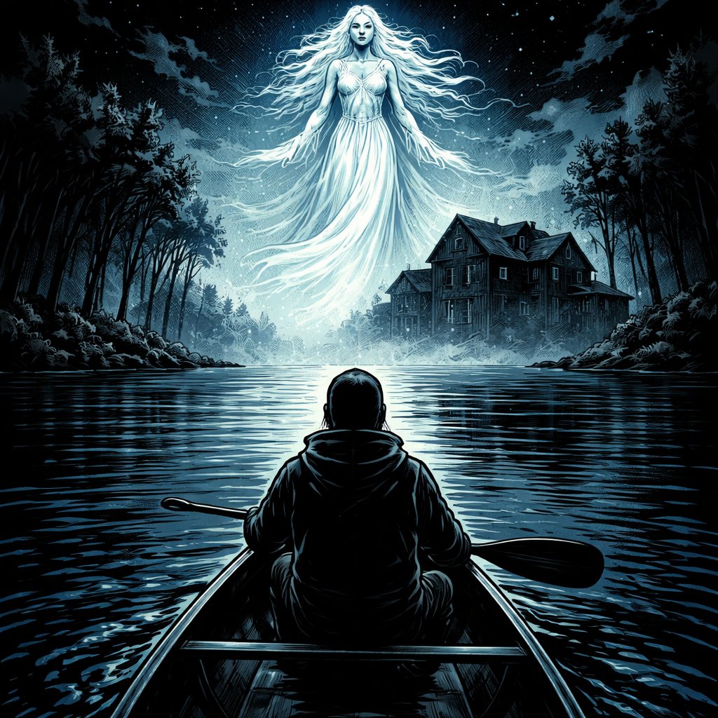 Asymmetric No caricature, no speech, bumble, realistic, dark night, a canoe on the lake with a silhouette the ghostly fa...