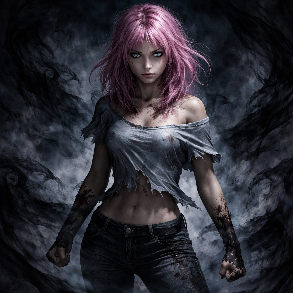 A 17 year old girl who has pink hair and dark blue eyes. She is wearing a light blue shirt and jeans. She looks like she’s ready to fight.