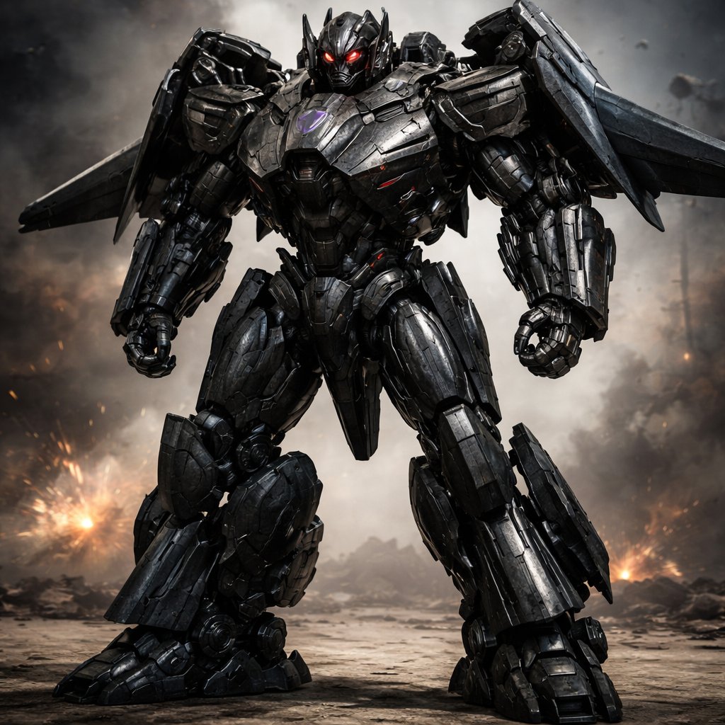 A full body picture of a black decepticon with red eyes who transforms into an Eclipse 500 jet