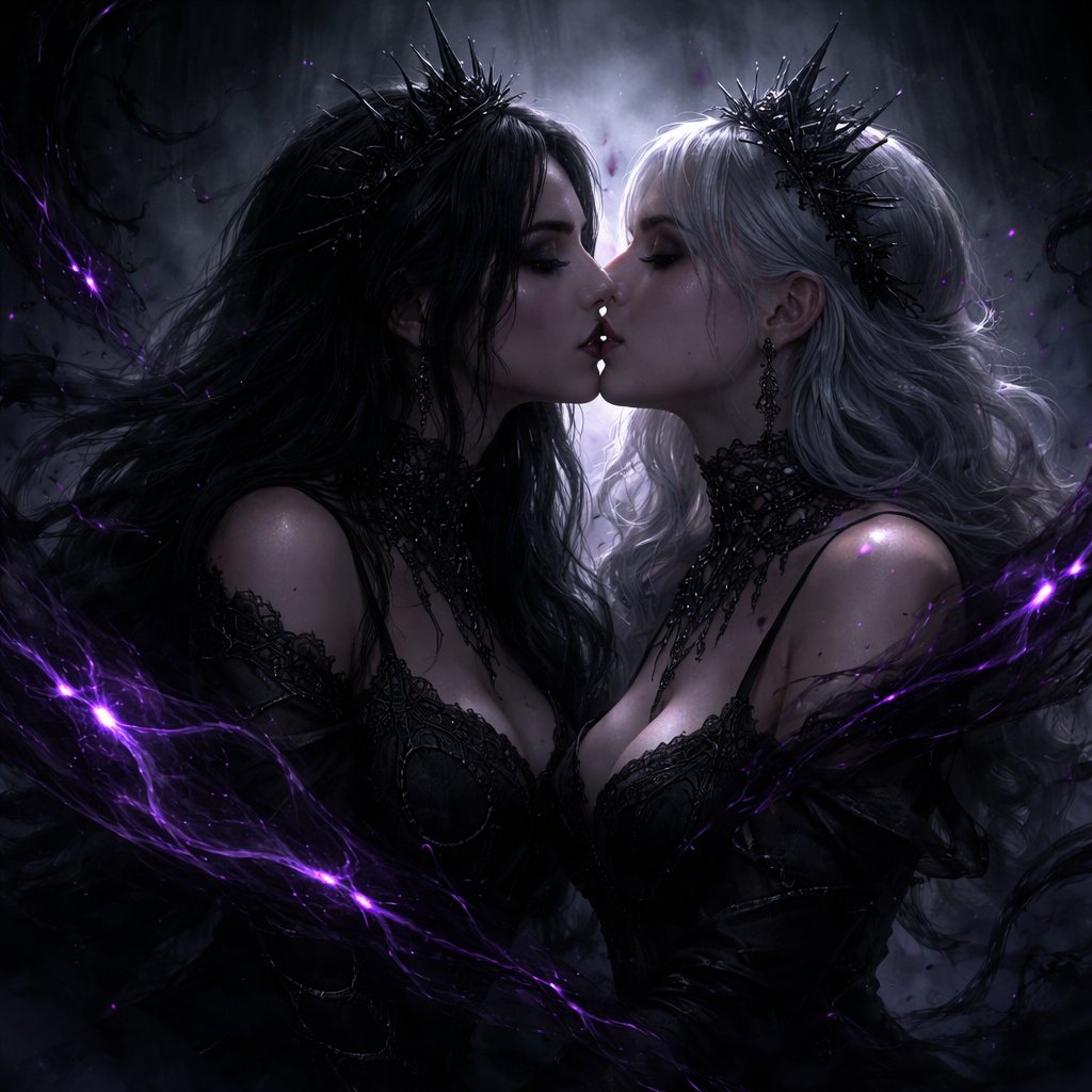 Two girls kissing, one girl- a 17 year old with brown hair, wearing a black leather jacket, blue Jean shorts and black s...