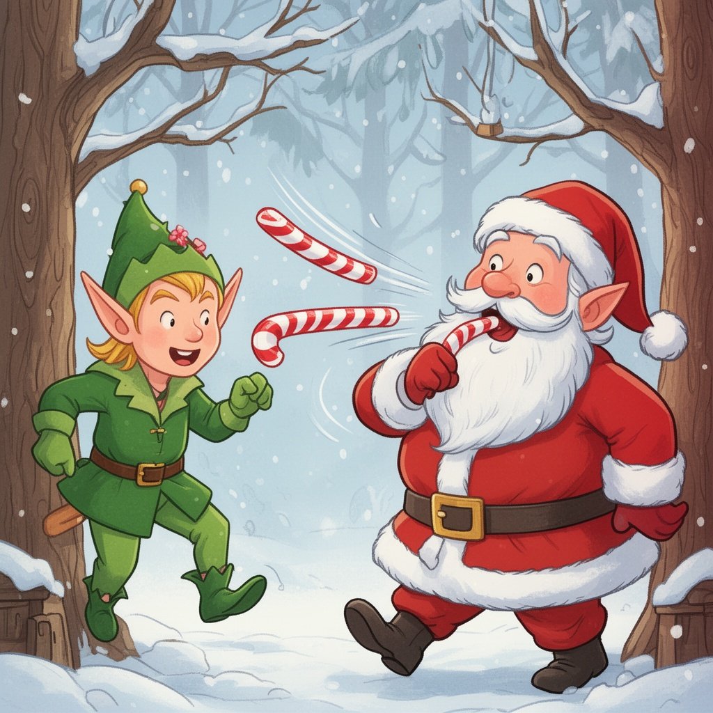 Elves vs Santa with candy cane being thrown at him and one in his mouth
