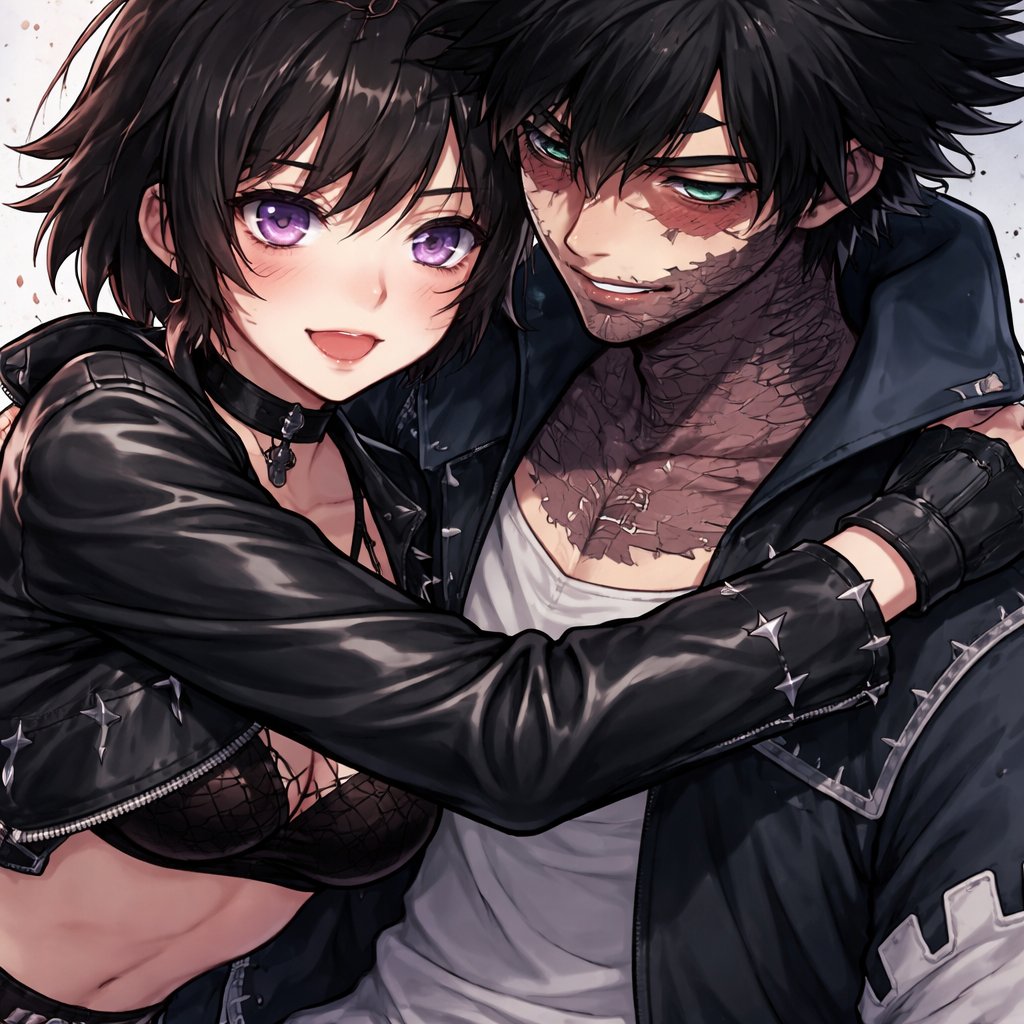 Pro hero Girl with short black hair and wearing villain clothes hugging Dabi from my hero academia