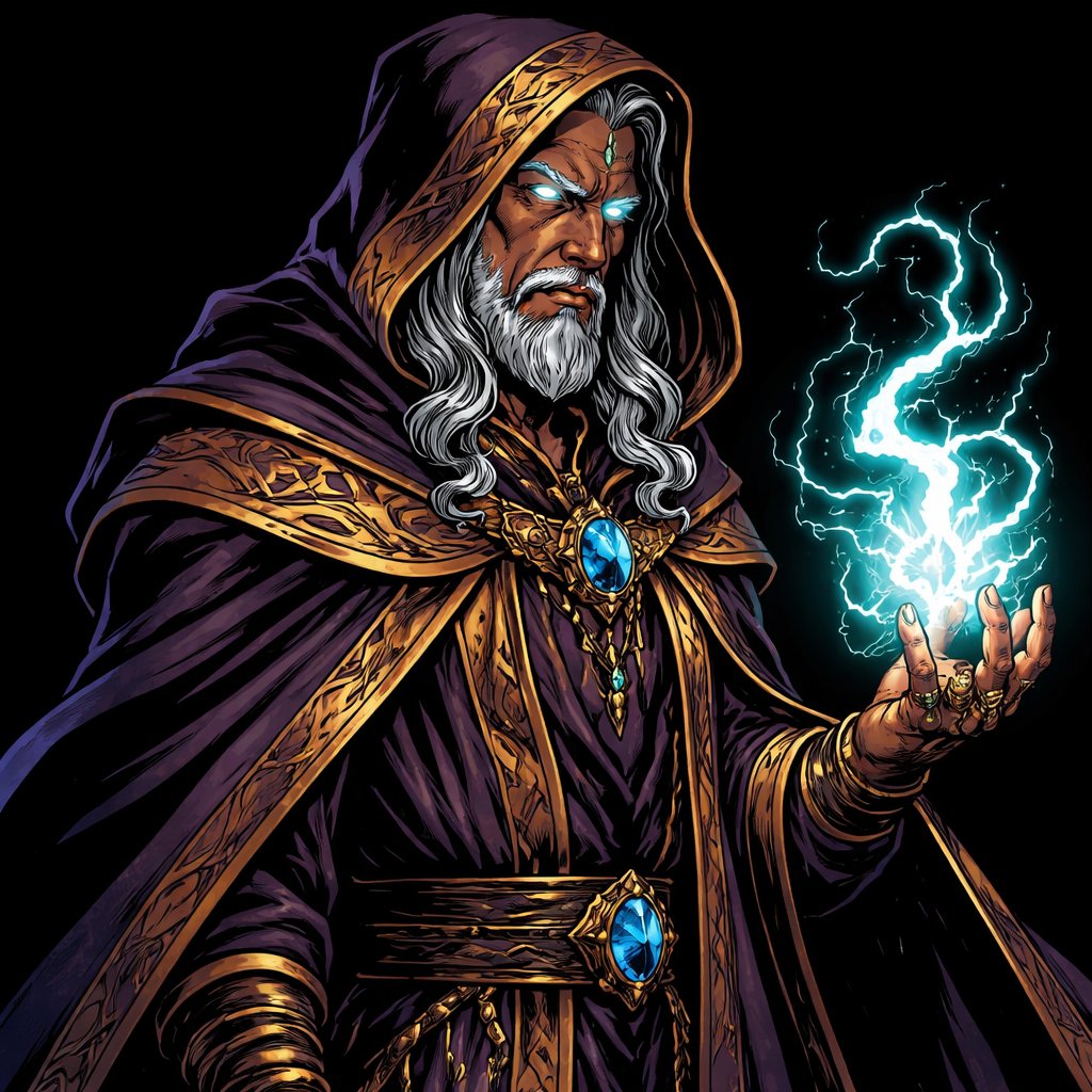 Realistic, refined . A mystic seen in three-quarter view from the left. The background is black. There are no speech bub...