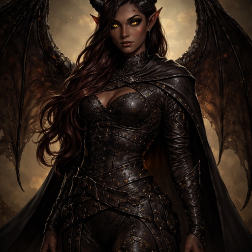 Tall, lean tiefling woman with dark, warm-toned skin and a controlled, confident posture. • Curved black horns, swept b...