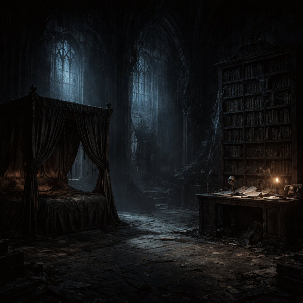 A huge dark room that has a bed in the left corner of the room. The bed has four pillars. In the far right corner is a wooden desk that has a small pile of papers and there’s ink and an ink pen next to the papers. Behind the desk is a big book shelf.