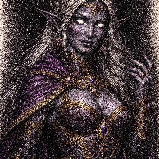 Make me a dark elf wearing purple and gold clothes