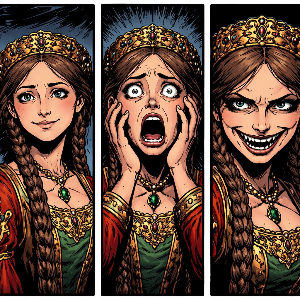 Realistic style, no dots. Three panels are very sly, attractive, mediaeval noble woman with small eyes, the same young w...