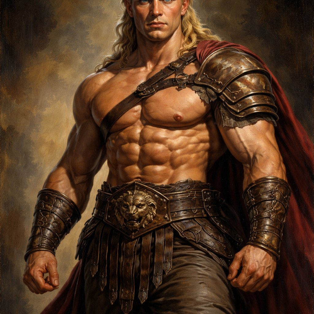 A tall well~proportioned figure with “broad-shoulders, thick neck, giving an impression of sheer power”. He has “rippling muscles on his, arms, chest, and legs”. His haircut is a blonde mullet. His “expression is often serene or determined, with deep-set blue eyes and strong brows, hinting at inner depth". He works at freak show as a strong man. His outfit consistsed of a gladiator outfit but with semi fitted brown pants.