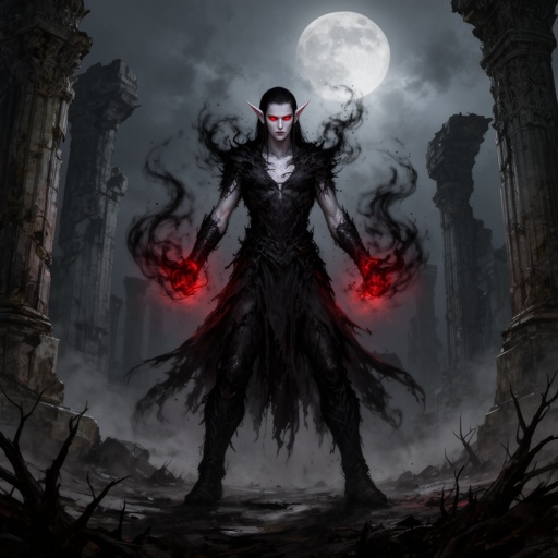 Tall dark pale male elf with a long dark cloak with purple detail and braided black hair with white streaks and white ey...