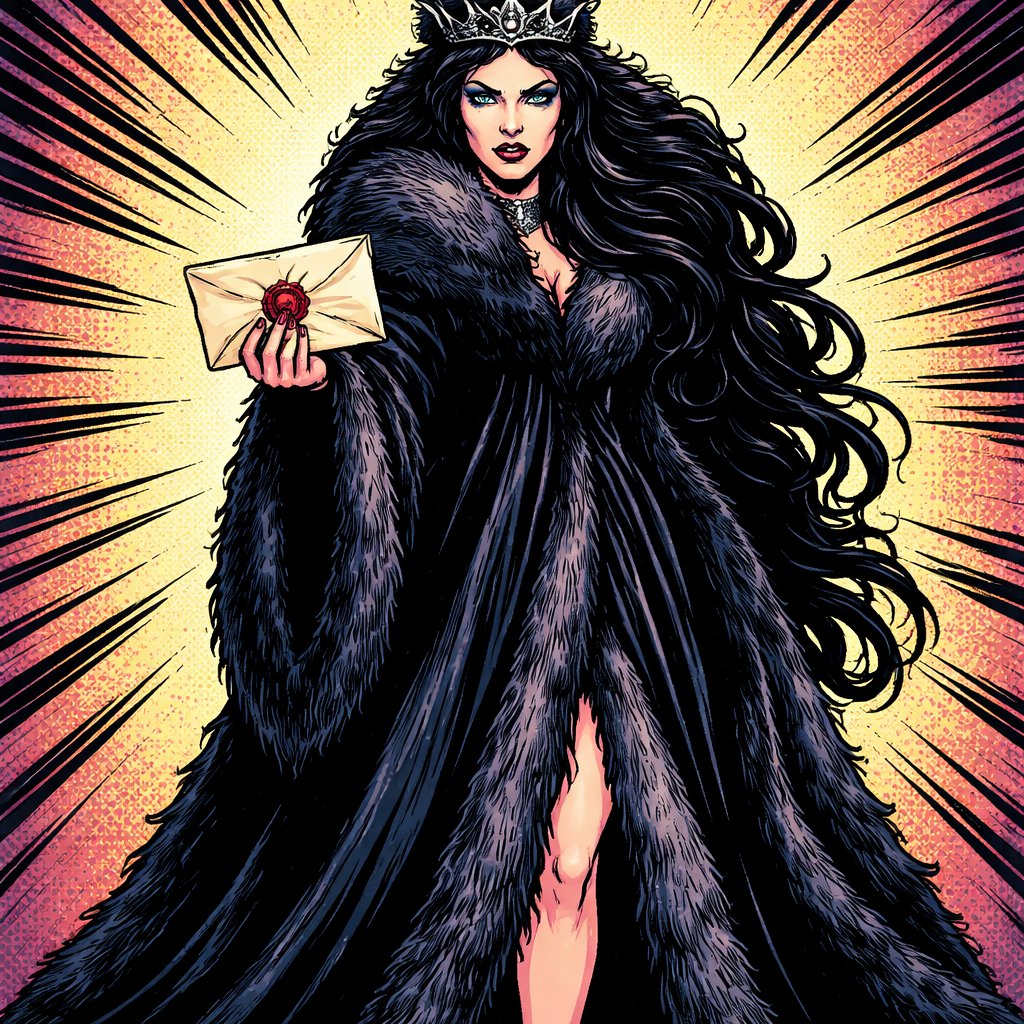 A tall, slim princess completely covered in a black fur robe with headdress full body shot in her right hand is a letter...