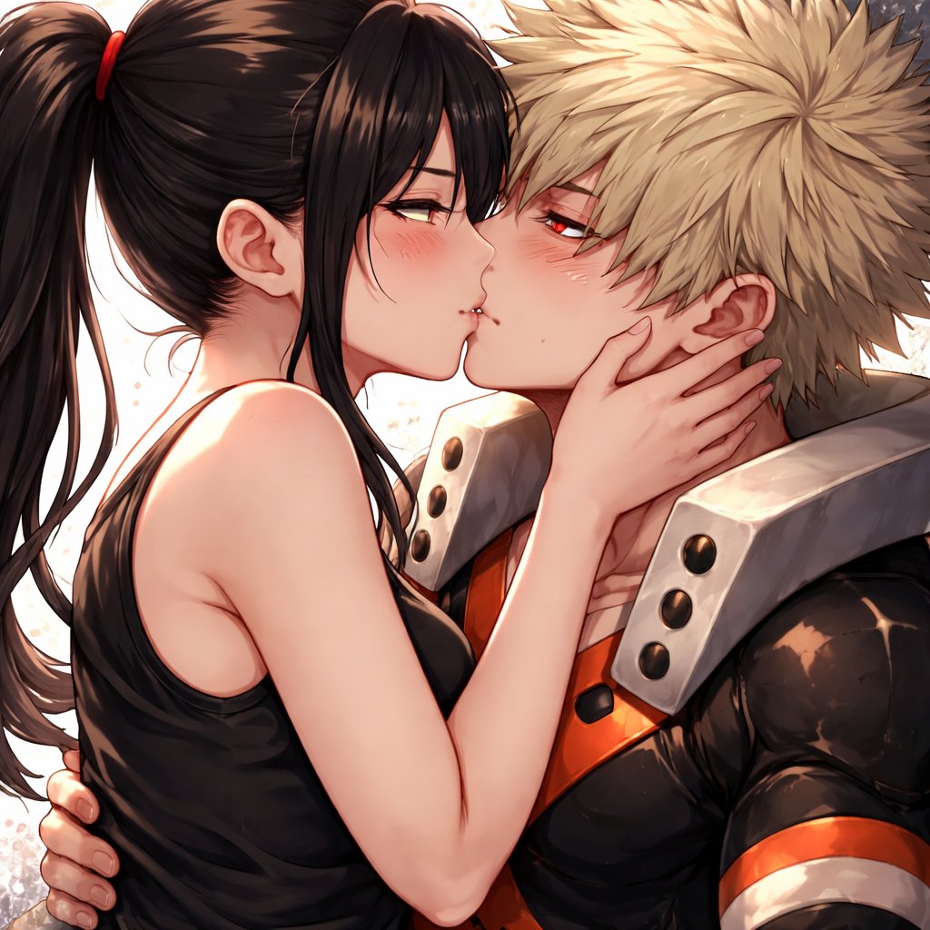Adult girl with a dark ponytail kissing Bakugou katsuki