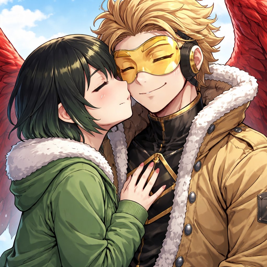Girl with short black hair and green tint kissing the number two pro red wing hero hawks