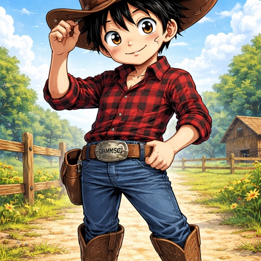 8 year old boy wearing a black and red checkered button down long sleeve shirt, brown leather cowboy hat, brown leather ...