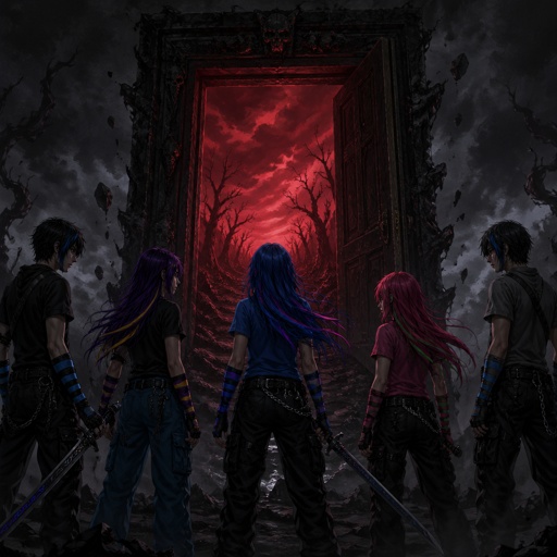 A 17 year old girl who has blue hair with purple and pink stripes and has hazel eyes. She is wearing all black. She has ...