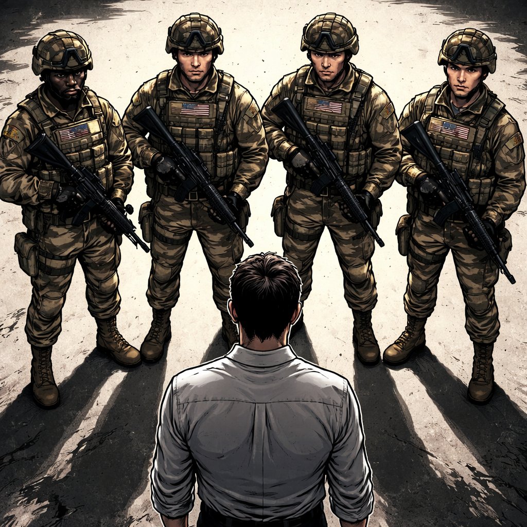 Refined realistic, no caricature four soldiers are standing in front of a man
