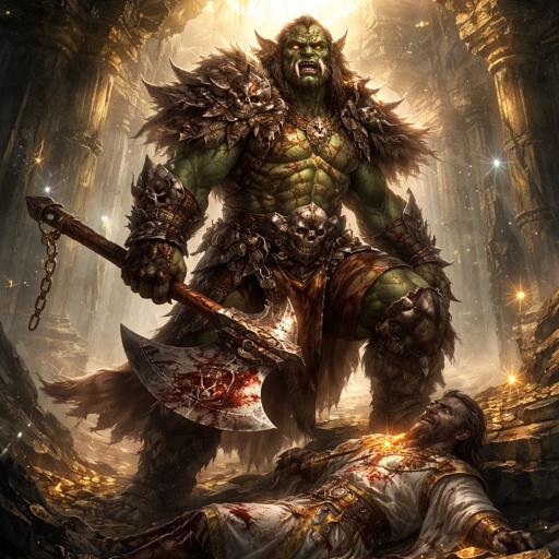 Half orc and half human Barbadian with large tusks standing on a battlefield