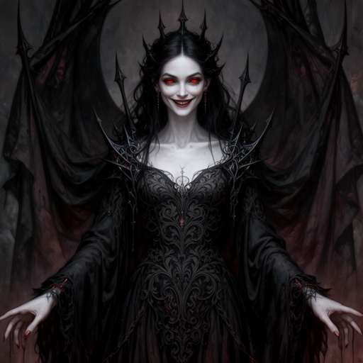 Beautiful woman with black hair and amber eyes dressed in a gothic gown wearing a black crown and black maleficent demon...