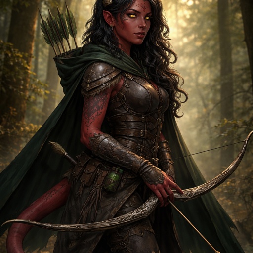 Dungeons and dragons female tiefling rogue. Silver hair, bronze skin, red clothing. Short nubby horns. Long bow. Thigh h...