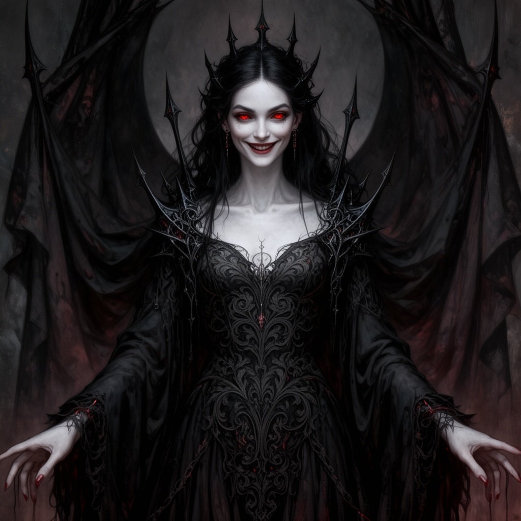A ghostly ethereal beautiful woman with dark hair and red eyes. She wears sophisticated clothing with intricate embroidery. She is a godlike figure with a malicious smile