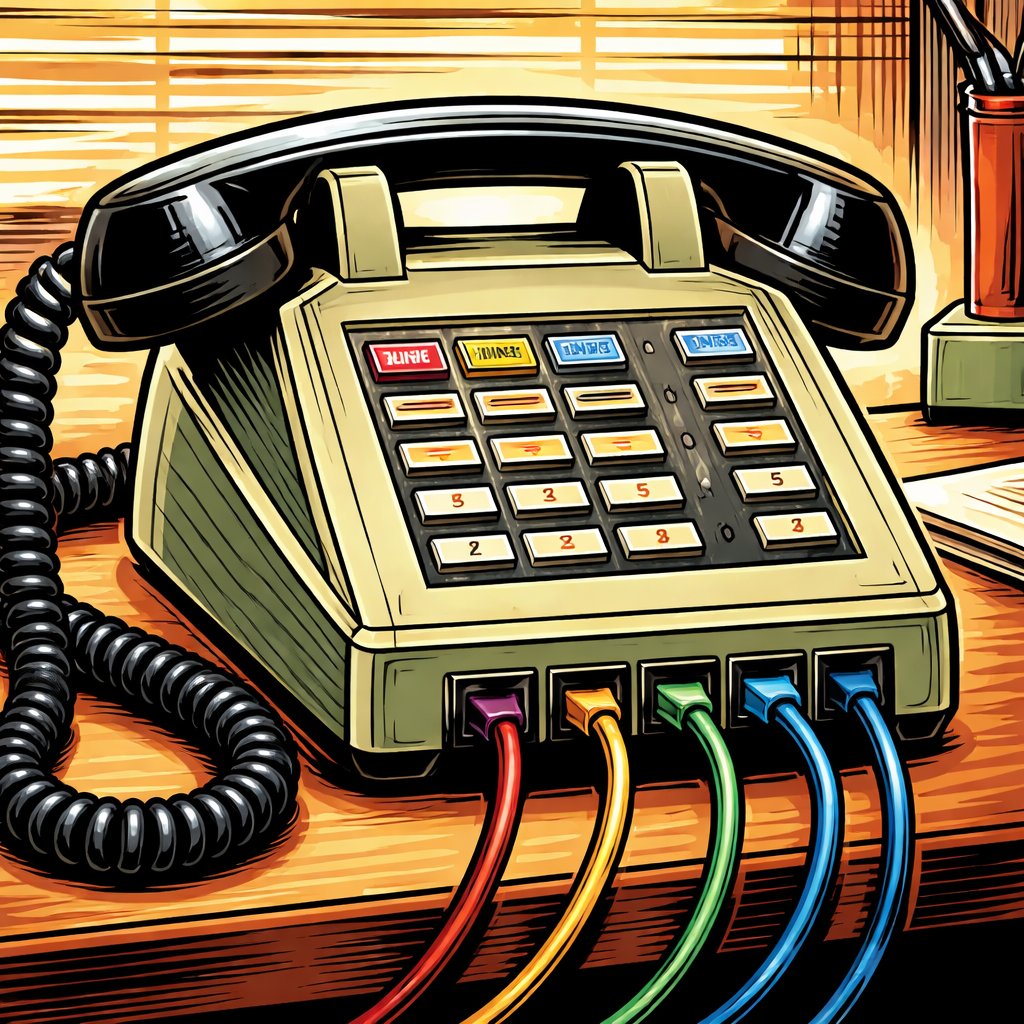 No caricature, no speech bubbles. An old-fashioned telephone with multi lines. three-quarter view from the rear.