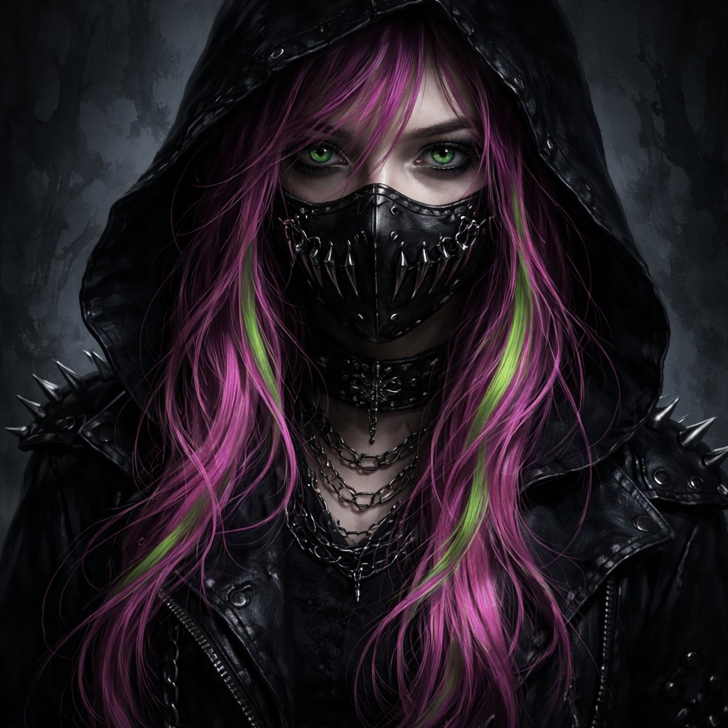 A 17 year old girl who has pink hair with green stripes and has green eyes. She is wearing all black. There is a mask that covers her mouth and nose. There is also a hood that covers part of her hair but some strands still show.