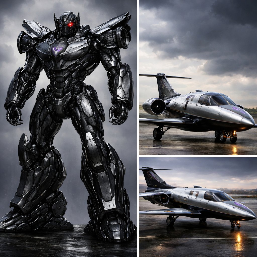 A black and silver decepticon with red eyes that transforms into an Eclipse 500 jet