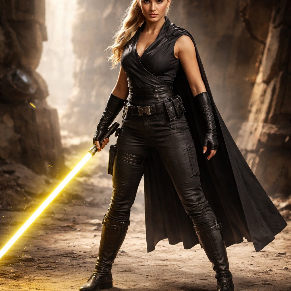 A full body picture of an appropriate female blonde Jedi in a black combat outfit holding a yellow lightsaber suspending...