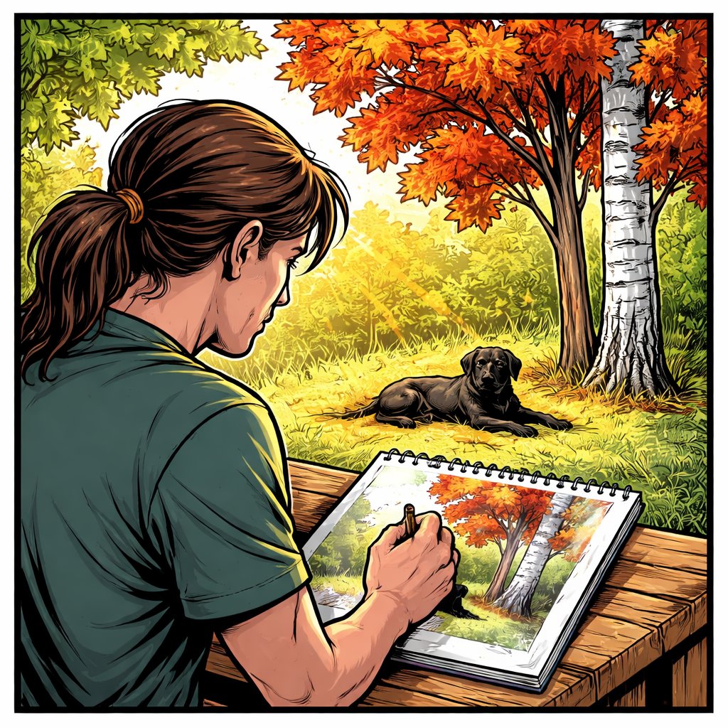 Realistic, no caricature no speech bubbles. A young man is drawing a picture of a maple and birch tree and a black dog warming itself in the afternoon sun. The boy is on the left of the picture as long brown hair. He’s in the mid 20s.