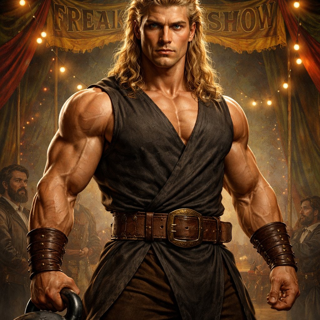 A tall well~proportioned male, so handsome he looks like a Greek god with muscles. With deep-set blue eyes and strong brows, hinting at inner depth“. His hairstyle is a blonde mullet. He works at freak show as a strong man. His outfit consistsed of a Charcoal-toned sleeveless tunic, thick leather belt, leather wristbands/cuffs, brown pants.