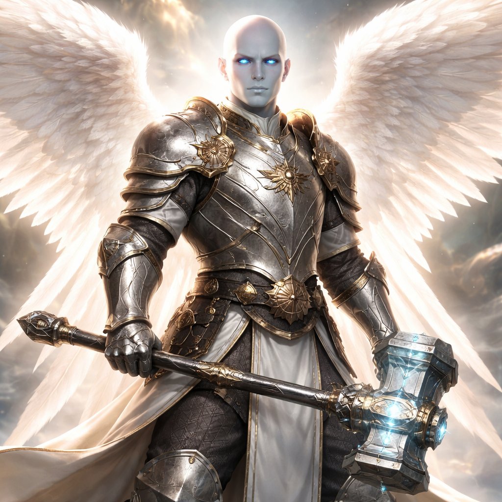 Blue eyed, fair skinned, shaved head, muscular Aasimar veteran Eldritch Knight. Wearing epic full plate armor with mag...