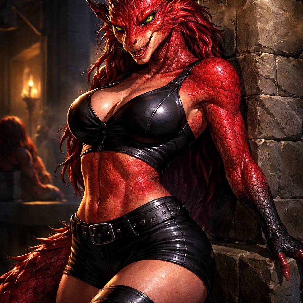 a deceptive dnd red dragonborn lady wearing a tight top and shorts